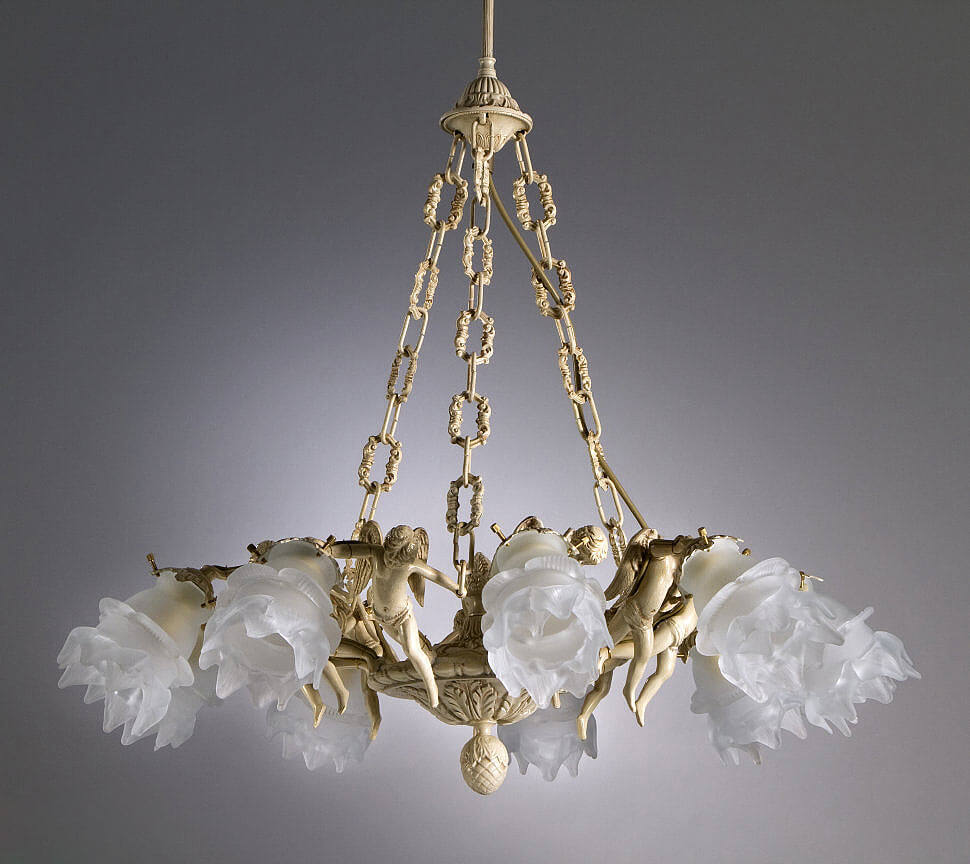 С виду обычная классика, барочный стиль при ближайшем рассмотрении оборачивается модерном. В модели есть несколько хитовых приемов: массивные состаренные бронзовые цепи, матовые асимметричные полураспустившиеся бутоны и фигуры ангелов цвета слоновой кости. Такое обильное наслоение деталей — довольно сложная интерьерная вещь и требует грамотного стилевого подхода.