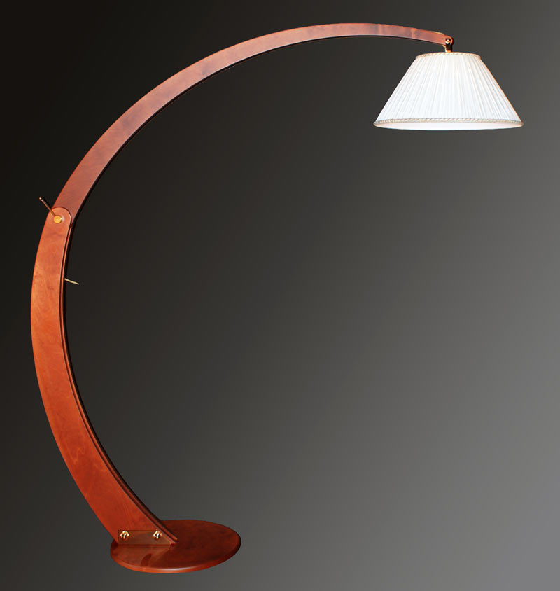 Итальянские дизайнеры по-настоящему отрываются на торшерах. Эта длинная ножка дает простор для фантазий. Ее отделывают камнем, зеркальными осколками, джутом и прутьями. Но в данном случае опора изготовлена из красного дерева и изогнута в форме месяца, верхний край его венчает небольшой скромный текстильный абажур. Так что все внимание — на опору.