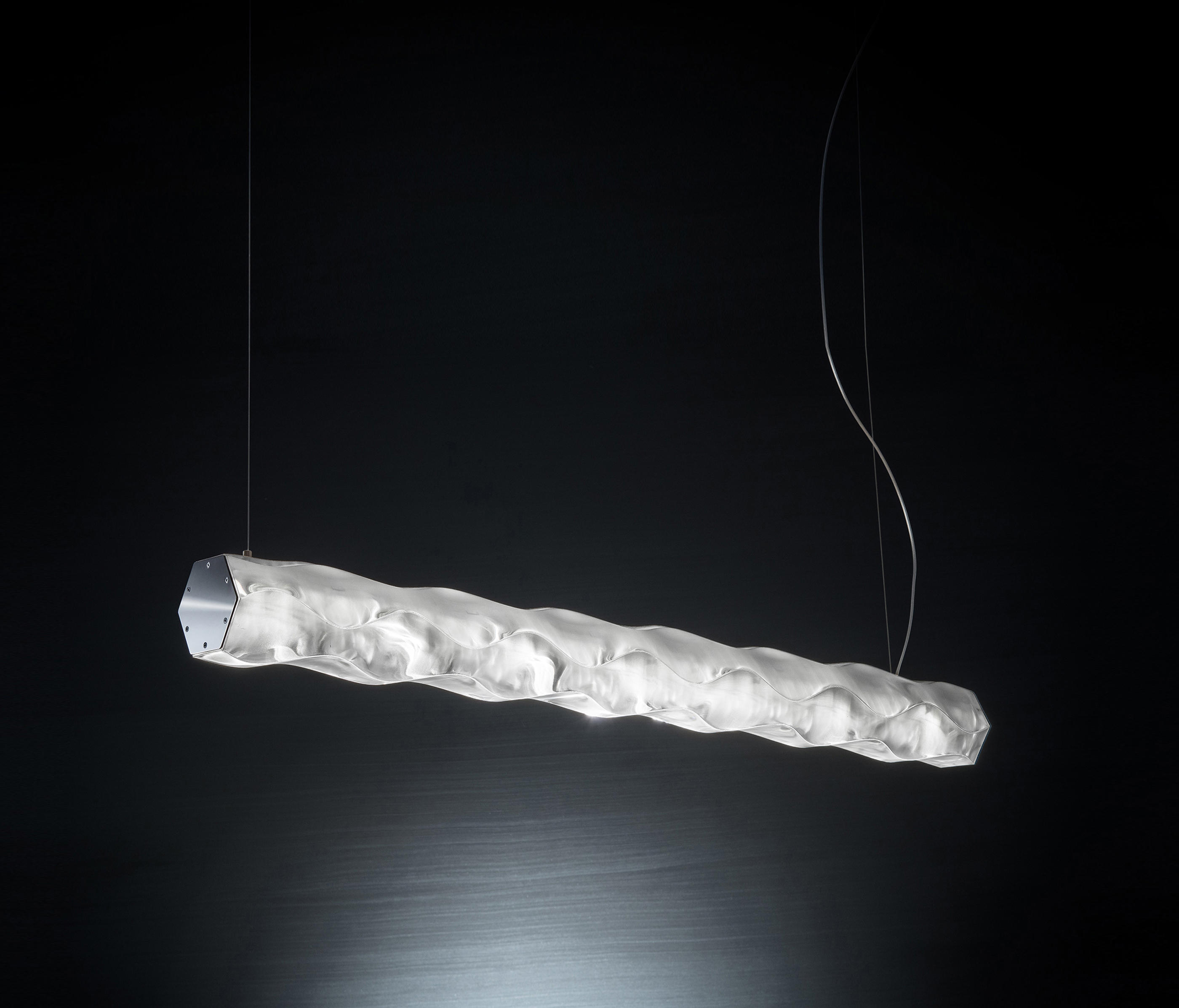 Бренд Slamp славится экспериментами с материалами и формой. Для этих светильников использован рассеянный мягкий свет и необычная, словно шелковистая фактура. Конструкции на подвижных кронштейнах-струнах могут крепиться параллельно и под углом.