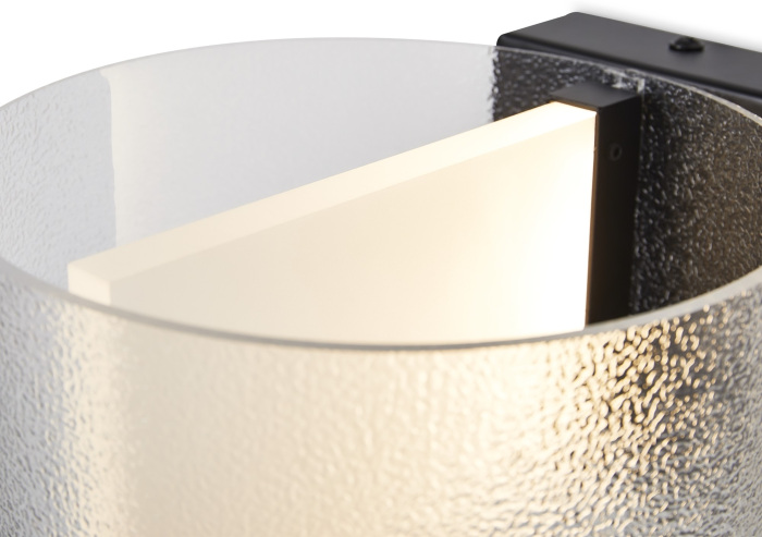 Корпус настенного светильника исполнен из надёжного металл, цвет каркаса - чёрный, цвет плафона - прозрачный, что придает этому светильнику благородности.