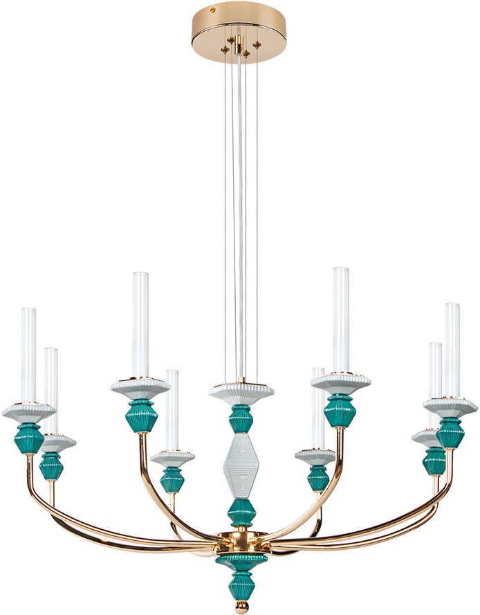 Каркас подвесной люстры исполнен из прочного металла, керамика, а золотой, белый, зелёный цвет добавит вашему интерьеру изысканности. Плафон выполнен в белом, прозрачном цвете, что добавляет модели легкости, изысканности и завершенность образа.