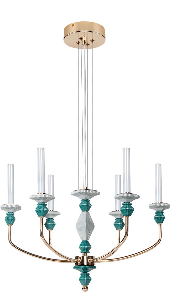 Каркас подвесной люстры исполнен из прочного металла, керамика, а золотой, белый, зелёный цвет добавит вашему интерьеру изысканности. Плафон выполнен в белом, прозрачном цвете, что добавляет модели легкости, изысканности и завершенность образа.