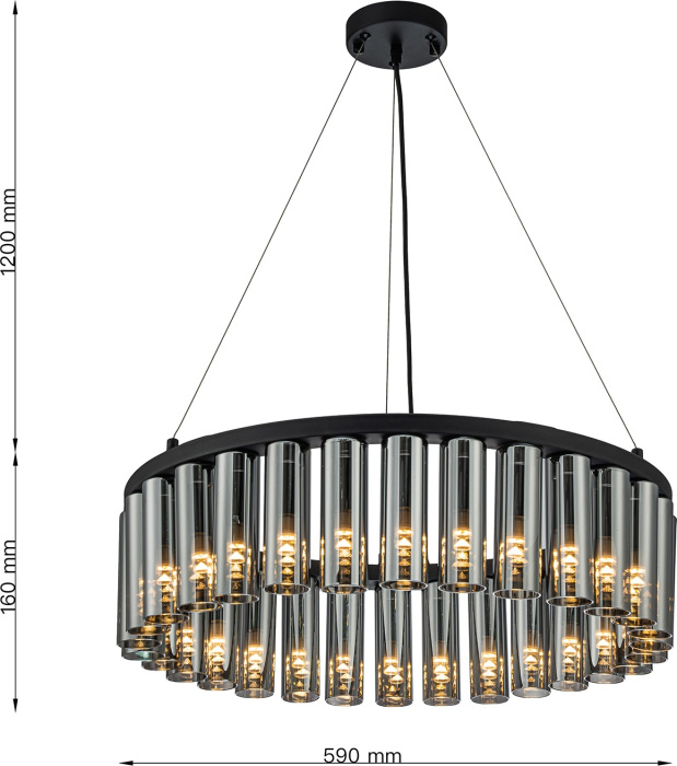 Размеры светильника: ширина 590 мм, высота мм. - такие габариты позволяют люстре гармонично смотреться как в просторных, так и в небольших помещениях.