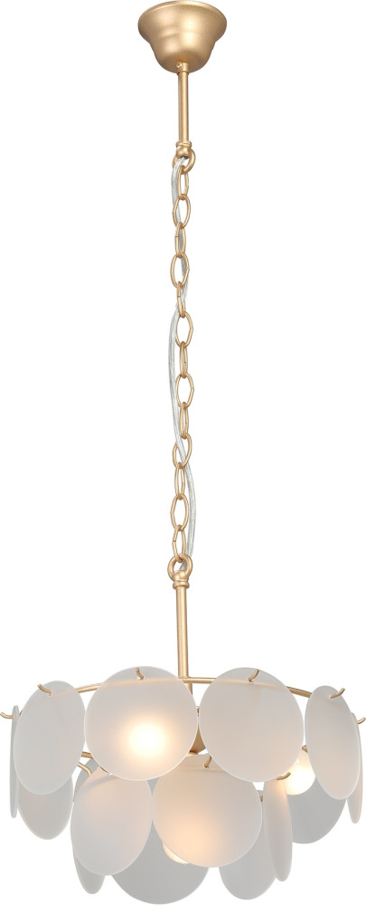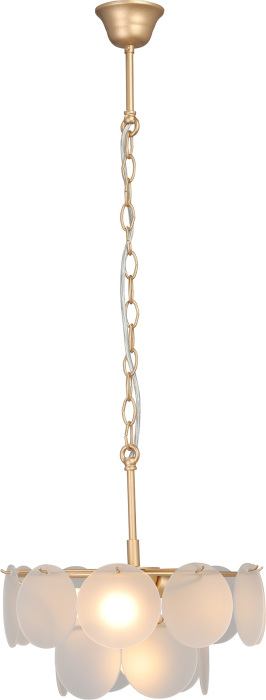 Каркас подвесной люстры выполнен из высококачественного металла, а золотой цвет придаст вашему интерьеру элегантности. Плафон выполнен в белом цвете, что добавляет модели легкости, элегантности и завершенность образа.