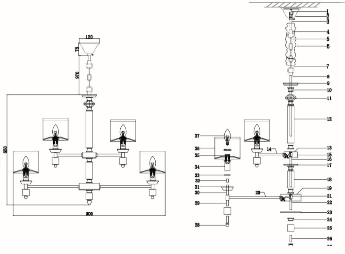 Для создания необходимого освещения в светильнике предусмотрены лампочки в количестве шт. с цоколем E14 и общей мощностью 600 Вт., что обеспечивает достаточное освещение помещения площадью до 45 кв.м.