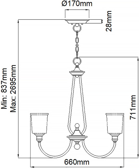 Размеры светильника: ширина 660 мм, высота 711 мм. - такие габариты позволяют люстре гармонично смотреться как в просторных, так и в небольших помещениях.