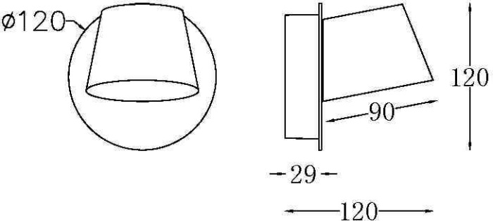 Размеры этого светильника – ширина 120 мм., высота 120 мм. Он идеально впишется для комнаты площадью до квадратных метров. Для создания необходимого освещения здесь использовано 1 ламп с цоколем LED и общей мощностью 7 Вт.