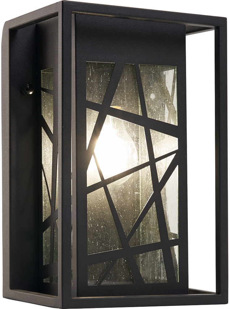 Корпус светильника выполнен из прочного кованого железа, окрашенного в черный цвет, что обеспечивает долговечность и устойчивость к внешним воздействиям. Прозрачный стеклянный плафон прямоугольной формы позволяет свету равномерно распространяться, создавая комфортную атмосферу.