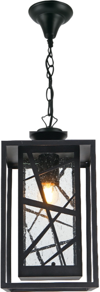 Корпус светильника выполнен из прочного кованого железа, окрашенного в черный цвет, что обеспечивает долговечность и устойчивость к внешним воздействиям. Прозрачный стеклянный плафон прямоугольной формы позволяет свету равномерно распространяться, создавая комфортную атмосферу.