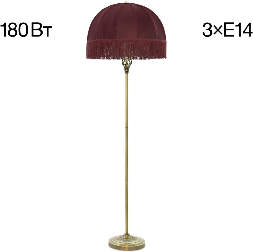 Размеры этого торшера – ширина 510 мм., высота 1640 мм. Он идеально подойдёт для комнаты площадью до 5 кв.метров. Для создания необходимого освещения здесь использовано 3 ламп с цоколем E14 и общей мощностью 180 Вт.