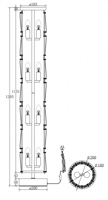 Размеры этого торшера – ширина 200 мм., высота 1265 мм. Он идеально впишется для комнаты площадью до 24 кв.метров. Для создания приятного освещения здесь использовано 8 ламп с цоколем E14 и общей мощностью 480 Вт.