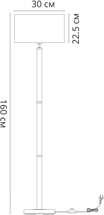 Размеры этого торшера – ширина 400 мм., высота 1600 мм. Он идеально впишется для комнаты площадью до квадратных метров. Для создания подходящего освещения здесь использовано 1 ламп с цоколем E27 и общей мощностью 60 Вт.